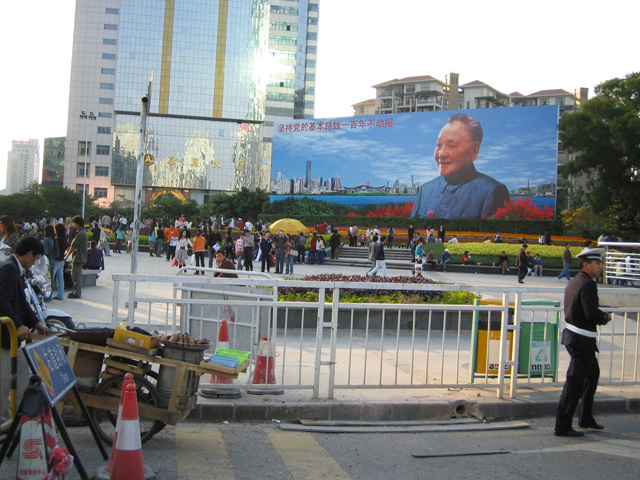 回家路过大剧院的邓小平画像前。
