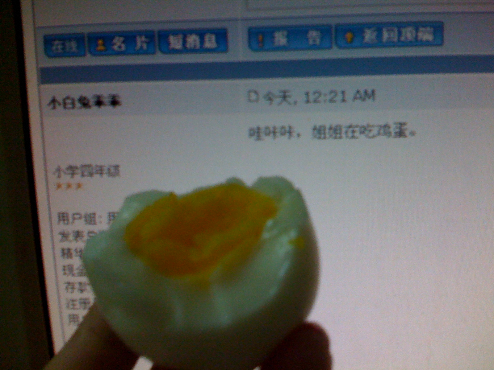 小 小白兔乖乖 大学三年级 注册 2012-11-22 消息 821 反馈评分 0 点数 1 2012-12-23 #52 哇咔咔,姐姐在吃鸡蛋。 附件 IMG_0307.jpg 579.4 KB · 查看: 310