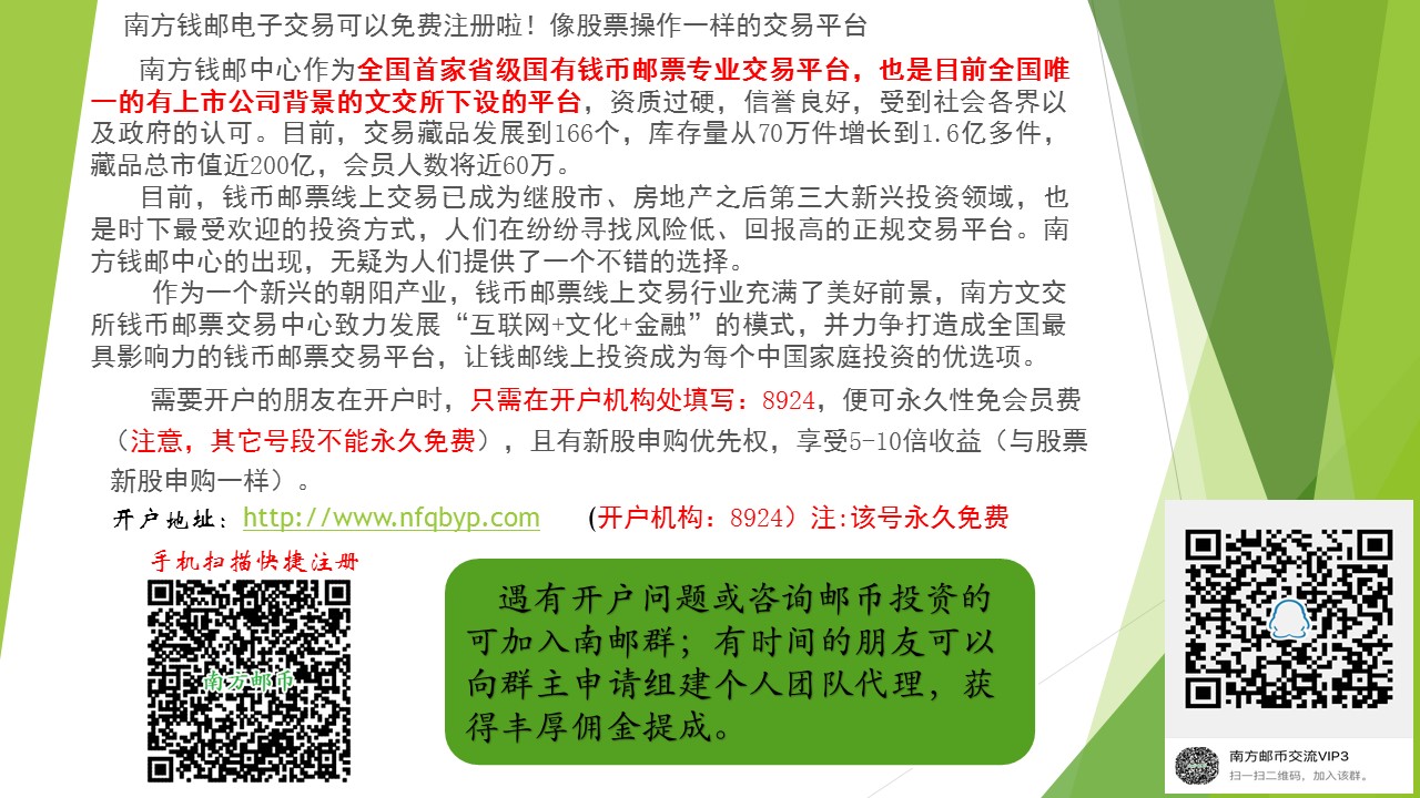 南方钱邮中心作为全国首家省级国有钱币邮票专业交易平台,也是目前全国唯一的有上市公司背景的文交所下设的平台,资质过硬,信誉良好,受到社会各界以及政府的认可。现向全面免费开放会员,详见下图:[attachmentid=350181]