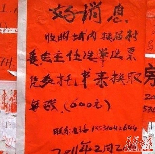 [attachmentid=255750] 广东遂溪街头公告叫买村委换届选票每张600元 这便是民选的弊端之一,照片显示,“好消息”红底黑字清晰的写着:收购城内换届村委会主任选举选票,凭委托书来换取每张600元。在公告的下方还留有购买者的联系电话。而公告右下角的日期显示,该公告的张贴日期为:2011年2月20日。