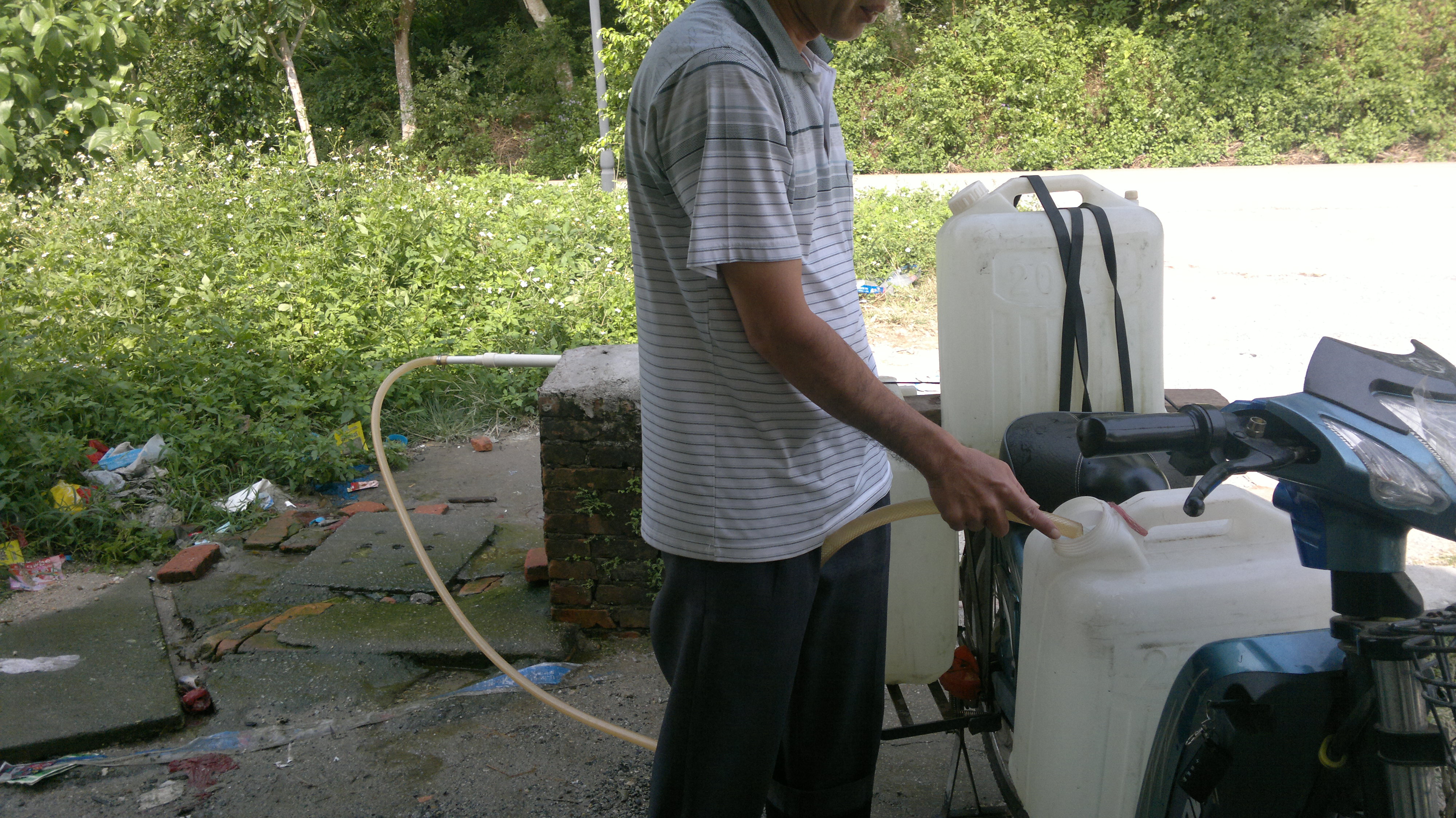 山泉水,从山顶引下来的,每天都很多人来拉